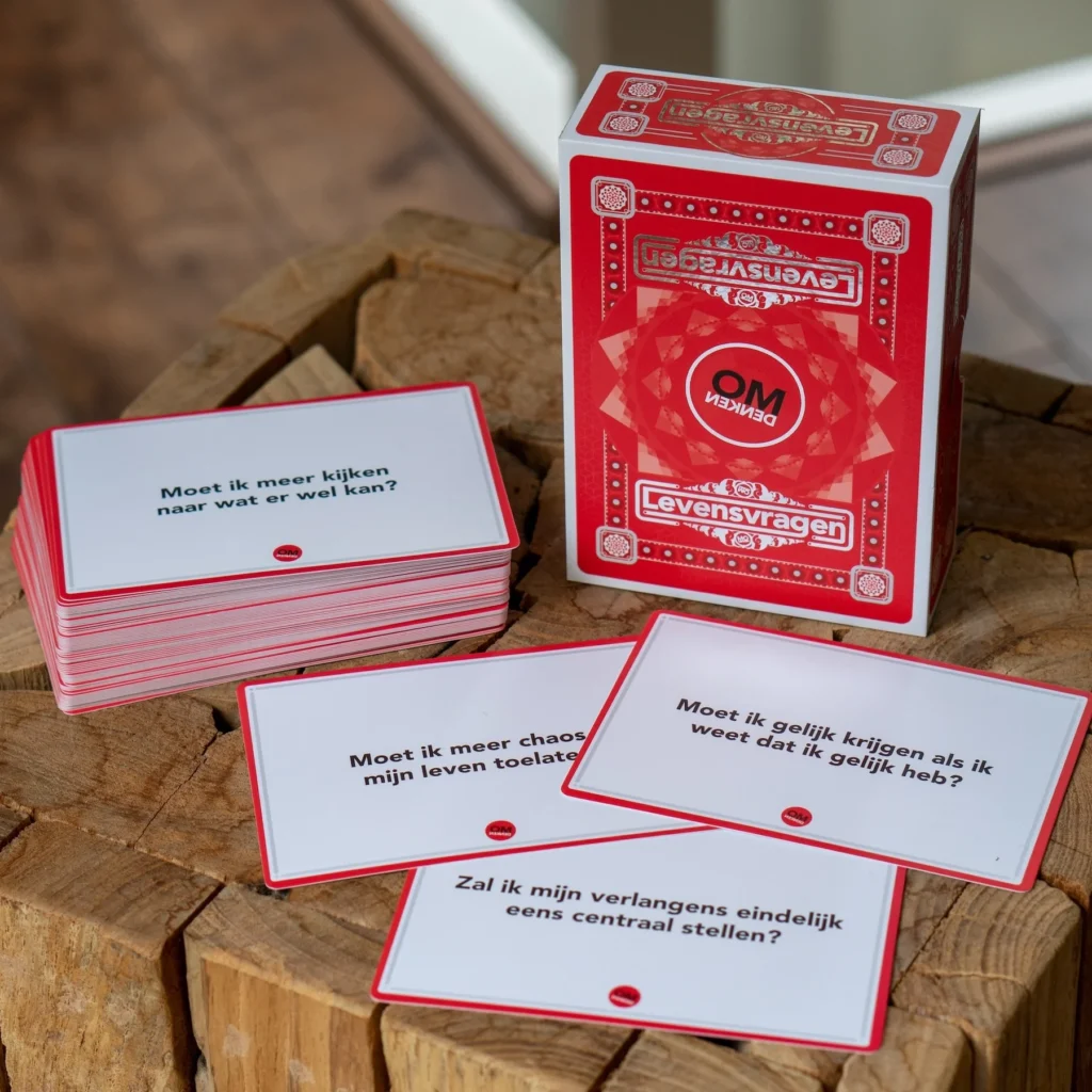 Dit kaartspel bevat 78 kaarten met vragen als “Zal ik stoppen mezelf te bewijzen?”, “Zal ik pas bang zijn als het zover is?” en “Zal ik eindelijk eens de handrem eraf halen?”.